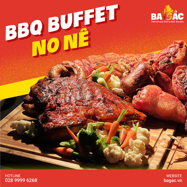 👉BBQ Buffet với các món đặc trưng “làm mưa làm gió” tại BA GÁC: Heo Cuộn Lá Ổi Da Giòn, Bò Xông Khói Thảo Mộc Than Tre, Sườn Heo Xá Xíu, Hỗn Hợp Xúc Xích Nhà Làm, Gỏi Xoài Cá Trê, Bánh Đa Xào Chay, Cơm Chiên Lá É, Khoai Tây Truffle Mayo,...